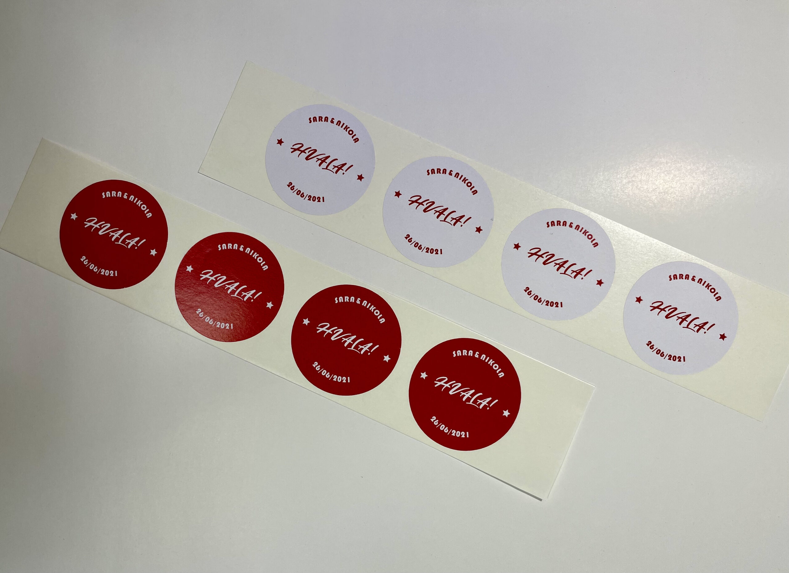 Naljepnice Naljepnice mogu biti tiskane na bijeloj ili prozirnoj pozadini. Tisak na njima može biti u boji, crno-bijelo, s lakom ili samo bijeli tisak. Mogu biti izrezane na pravilan oblik ili neki poseban, krug, sa zaobljenim rubovima…